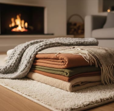 Textiles bring softness, visual depth, and tactile warmth to interiors. Bouclé sofas, velvet armchairs, wool throws, and woven rugs are used to add subtle richness. Layered fabrics, such as a wool throw over a curved sofa or velvet cushions on a neutral armchair, soften architectural lines and create a quieter, more relaxed environment.