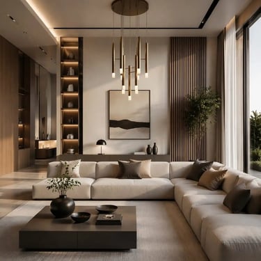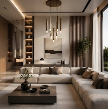 A contemporary living room is characterized by clean architectural lines, a restrained and cohesive color palette, and a thoughtful layering of textures. Furniture pieces are simple in form yet rich in material quality, often blending natural finishes with subtle modern detailing. Lighting is integrated as part of the design composition, enhancing depth and atmosphere rather than acting as a standalone feature. Decorative elements remain minimal and sculptural, while the overall layout prioritizes flow, openness, and functional comfort. The result is a space that feels modern, balanced, and quietly sophisticated.